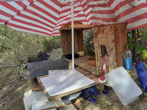 Als wir gerade ein „Dach“ für die Futterstelle bei den Mülltonnen fertiggestellt hatten, erschien eine keifende Frau aus der Nachbarschaft und erklärte mir, dass dieses Grundstück ihr Eigentum sei und ich alle kleinen Unterstände entfernen und zerstören müsse. Andernfalls würde sie mich vor Gericht bringen. Sie konnte sich nicht beruhigen und hörte etwa 20 Minuten lang nicht auf, mich zu beschimpfen.